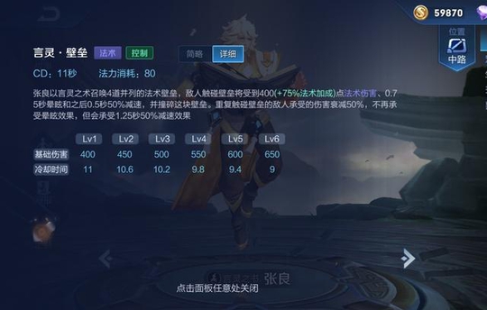 张良以言灵之术召唤4道并列的法术壁垒,敌人触碰壁垒将受到400(+75%法术加成)点法术伤害、0.75秒晕眩和之后0.5秒50%减速,并撞碎这块壁垒。重复触碰壁垒的敌人受到的伤害衰减50%,不再承受晕眩效果,但会承受1.25秒50%减速效果