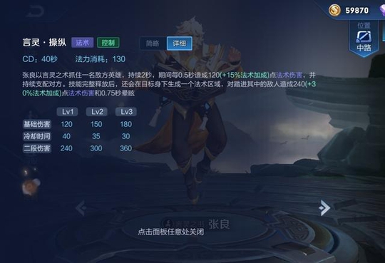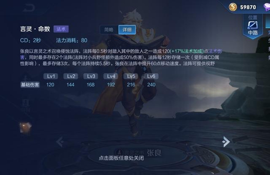 张良以言灵之术抓住一名敌方英雄,持续2秒,期间每0.5秒造成120(+15%法术加成)点法术伤害,并持续支配对方。技能完整释放后,还会在目标身下生成一个法术区域,对踏进其中的敌人造成240(+30%法术加成)点法术伤害和0.75秒晕眩