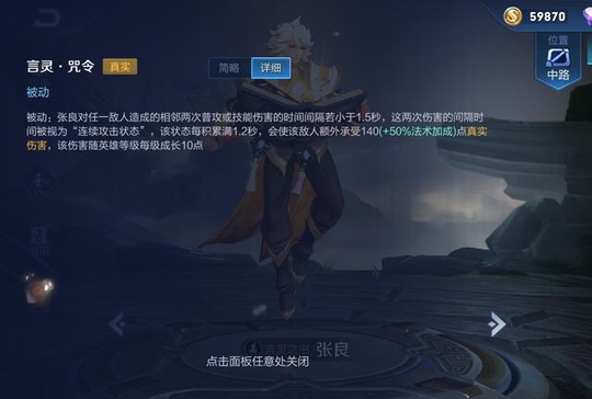 张良对任一敌人造成的相邻两次普攻或技能伤害的时间间隔若小于1.5秒,这两次伤害的间隔时间被视为“连续攻击状态”,该状态每积累满2秒,会使该敌人额外承受140(+50%法术加成)点真实伤害,该伤害随英雄等级每级成长10点