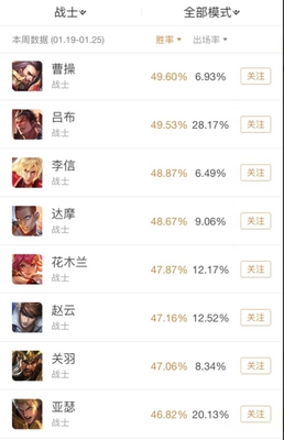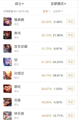 随着射手的崛起,战士作为常用的上单英雄日子不太好过。不过作为上个赛季最风光的职业,瘦死的骆驼比马大。在本赛季战士的表现还是可缺可点的。像典韦,铠皇这样强大的战士仍然在比赛中拥有一席之地,且胜率不俗。本赛季吕布,宫本武藏均有加强,出场率有所提高,不过由于射手加强更多,胜率方面没有多大增进。作为热门打野的孙悟空,胜率在更新后下滑了。这是由于,后期局更多,而射手6神装后,孙悟空抓人其实是个危险活。被反杀几率很大。狂铁垫底没有变动。