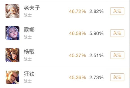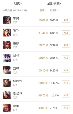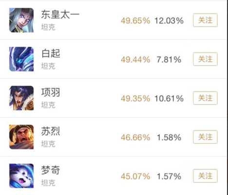 随着头几个版本对于坦克的削弱,当下版本坦克的出场率都不高,出场率最高的是程咬金,但也只有16.60%的出场率,而且往往走的半输出的战士路线。在坦克没削弱之前,5人队里往往两名坦克的搭配是很好的。如今如果出两名坦克,那么胜率就会比较低了。一名坦克或者没有坦克成为主流。牛魔和张飞作为胜率最高的两名坦克,出场率都不到10%。不过这两位靠着过硬的身板和不俗的控制,仍然能拥有不俗的胜率。