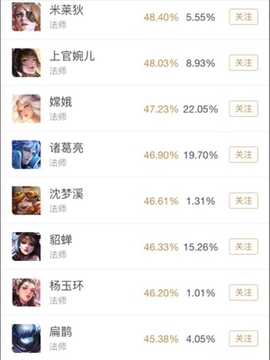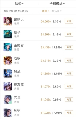 法师在本赛季相对来说工作稳定,就改动了甄姬一位法师。并增加了新英雄嫦娥。法师装备虽然有所改动,不过多是冷门装备。影响不大。本赛季,法师一姐武则天无人撼动。而甄姬加强后,出场率增加了。王昭君作为上个版本改动最大的英雄,在当今版本仍然强势,出场率和胜率都很高。嫦娥作为新英雄,经历了一段时间的大热后关注度不断下降,由新赛季敢开始时候40%左右的出场率变为现在的22.05%。作为一个新英雄,并且优点和缺点都和能突出,胜率表现并不亮眼。本赛季法师里表现最亮眼的还是墨子这个英雄。胜率达到54.39%,除去武则天就是他胜率最高了。不过墨子这个英雄更多的是走辅助的路线。姜子牙作为长期垫底的法师没有什么变动。