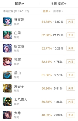 辅助在当下版本仍然是上分的好选择,一共八位辅助英雄,胜率都不俗。蔡文姬以54.78%胜率依然霸占辅助第一位。辅助胜率前3的三位英雄出场率都超过了10%。且胜率都不俗。在当下射手强势的版本里,明世隐成为高端局非ban必选的一个辅助。一个会玩的明世隐配合射手是能破坏游戏平衡的存在。在当今射手横行的比赛里。学会明世隐,上分妥妥的。