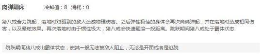 一技能,肉弹蹦床,两段跳跃位移,可以穿墙,第二次跳跃后向前翻滚, 跳跃过程中霸体 。 是八戒追击和逃命的关键技能,建议主加 。