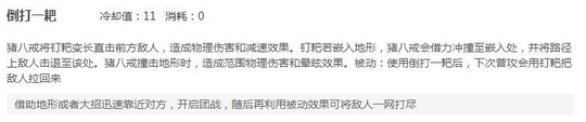 二技能,倒打一耙,向前面打出一下加长的钉耙, 碰到地形可以形成位移,并将敌人击退 ,有点像达摩的一技能加大招,下次普攻有个 钉耙拉人 的效果。