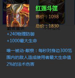 第二件,红莲斗篷,经过几次调整,红莲现在已经属于冷门装备了,但是很适合八戒, 第一可以撑血量,第二,红莲的被动伤害跟英雄血量挂钩,且灼烧效果是范围伤害,配合八戒的被动可以回血 ,尤其是敌方英雄或者小兵多的情况下。