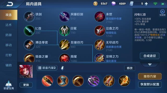 出装选择 红色打野刀最大增加伤害 鞋子看情况控多就韧性鞋 下面第一件410吸血镰刀配合符文百分之8完美续航 轻松过渡前期 然后暗影战斧快速增加前期伤害 由于大招小砍 无尽电刀增加了大量普通攻击伤害 团战中依靠普通攻击主打伤害