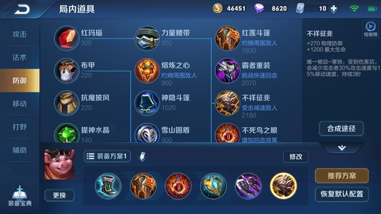 出装方面为肉为主 也可以选择全肉暗影战斧换成防御装备 第一件红莲快速清线 然后 不死鸟配合被动快速回血 极寒风暴频繁的使用技能。血量越多伤害越高堆纯肉就行了 顺风就出暗影战斧减少CD和增加伤害