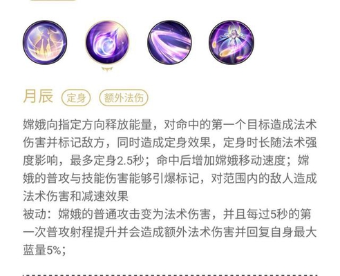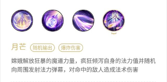 一技能: 嫦娥向指定方向释放能量,对命中的第一个目标造成伤害并标记敌方同时造成定身效果,定身时长随法术强度影响,命中后增加移速;嫦娥的普攻与技能伤害能够引爆标记,对范围内的敌人造成伤害和减速效果。