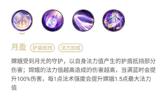 被动技能: 嫦娥会以自身法力值产生的护盾抵挡60%伤害,每1点法力抵挡2点伤害;嫦娥的法力值越高造成的伤害越高(最高满蓝提升100%伤害),每1点法术强度会提升嫦娥1.5点最大法力值。