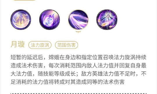 二技能: 嫦娥在身边和指定位置召唤法力旋涡,造成伤害的同时消耗范围内敌人法力值并回复自身法力值,敌方英雄法力值不足时,不足消耗的法力值将转成对其造成同等的伤害。