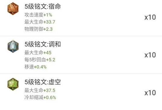这是一个通用的肉铭文,你攒不了吃亏也攒不了上当,适用于大部分的肉盾,我们的白起当然也可以选择,这就是传说中的调和虚空宿命,增加的生命值,护甲,移动速度,都是白起迫切需要的,更别说还有攻击速度,冷却时间。