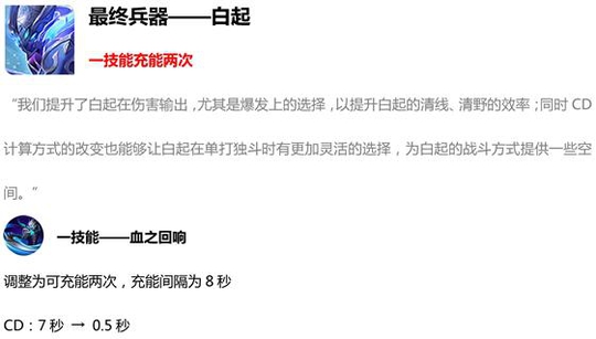 1月30日版本更新之后,白起重新被大家想起,我们平时使用白起的感觉是什么?上单的时候感觉清线很慢,导致始终是在节奏上慢半拍,现在完全可以解决了,我们的最终兵器,一技能存储两次,这样我们在用的时候就可以连放两次,或者是每4秒放一次,这样我们就能持续性的造成aoe伤害了。让我们看看更新内容: