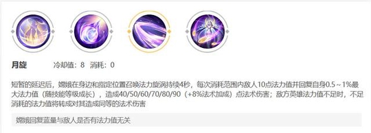 嫦娥最主要的输出消耗技能同时也是法师们唯恐避之不及的存在。吸取对手蓝量并回复自己的蓝量,又被动给自身加上了护盾,又有高额伤打得对手害怕。回复蓝量是技能必然产生的效果,与对手是否是蓝耗英雄没有关系。