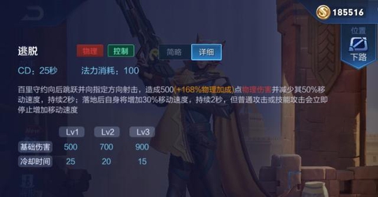 百里守约的大招,具有位移效果,可以很好的躲避刺客的切入,并且伤害很高,用来收割残血目标,周围有墙体的话,可以通过大招位移过墙,然后隔墙输出。