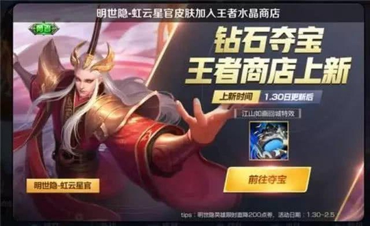更不要说夏侯惇的荣耀典藏皮肤了,这次的皮肤里面可以说除了明世隐的皮肤是用王者水晶兑换,其他的皮肤都是需要氪金的。而在昨日的时候,我们的峡谷里面更新了新的版本,这次的更新主要是调整英雄、上架新英雄和预热春节的活动,目的自然是让玩家早日的融入春节的氛围中。