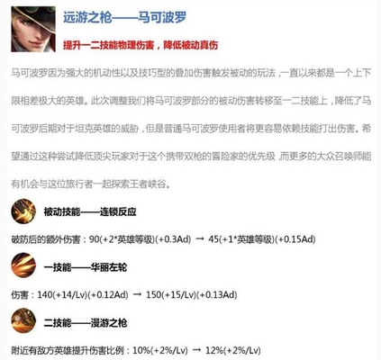 在2019年1月30日的更新里,天美终于留意到了这个英雄,我们的马可波罗大幅增强二技能的被动伤害和一技能的冷却时间,一二技能的改动让他在前期等级不高的时候也能打出足够多的伤害,增加他的对抗能力和刷野速度。特别是一个靠被动技能刷野的射手,减少的冷却时间真的很重要,二技能作为马可波罗的特色技能,可以在草丛外提前就预知周围有敌人的存在,现在一级增加的伤害等于以前15级才加满技能的属性,更是如虎添翼。