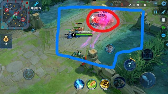 蓝色区域就是可以滑动的地区。看视野可以用3指操作在小地图上滑动,也可以用屏幕直接滑动。这种直接在屏幕上滑动也很不错,看看各位小伙伴喜欢来自己决定。红色区域就是一个小重点,墨子清兵的小妙招。出门学2技能,之后主1副2。等兵线相遇后,第一炮打后面2只小兵,第一只小兵不要打,让自己的小兵去打,第2炮再打后面2只就可以打死后面的2只小兵了,然后用普攻补掉第一只。发育快就需要练习补刀,补最后一下,算准伤害,尽量完美快速地补刀。