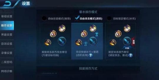 1、 基础操作设置 ,点出补兵跟推塔键,选择优先攻击血量最少。补兵跟推塔键主要作用有两个,一个就是用来强拆防御塔跟水晶的,第二个就是守防御塔和水晶的强制点兵。优先攻击选择血量最少,能够先点杀一个让对方减员才是重要的,不然容易让对方残血逃生,而且优先攻击血量最少可以从容的补兵。