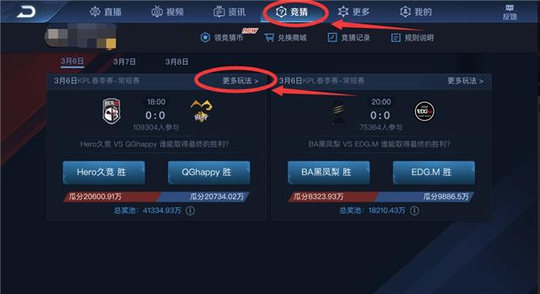 各位王者峡谷召唤师只需要通过游戏大厅中的“赛事”入口,进入“竞猜板块”,不满足于压胜负的召唤师还可以点击“更多玩法”。具体操作步骤请各位召唤师参照以下图解。