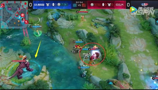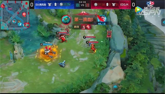 因此,BA在中路的选择上,选择了清线能力强的王昭君,辅助选择了太乙真人。这二人在中路的抢线能力极强,太乙真人也能在中路清完兵线后转向下路支援狄仁杰,防止狄仁杰被EDG.M击杀限制发育。而且,狄仁杰选择暴君路,在线上对边路战士有着较强的压制力,本局比赛中,一诺的狄仁杰就凭借对孙策的射程压制,在前期就不断压线、摸塔,在暴君处开团前,配合队友将辅助牛魔快速打残,随后拿下暴君。取得前期优势。