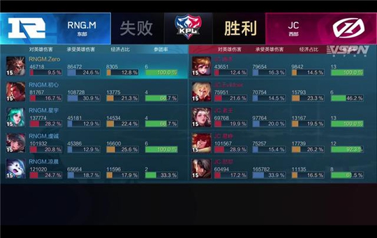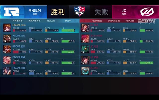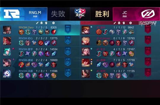 双方平稳开局,3分钟,下路团战,JC盾山将RNG.M公孙离背到塔下,双方爆发团战,JC打出一换二。4分钟,RNG.M沈梦溪配合队友击杀JC花木兰。8分钟,JC盾山被RNG.M打至残血,JC盾山在防御塔下极限修塔逃生。9分钟,RNG.M沈梦溪击杀JC花木兰。10分钟,RNG.M孙膑击杀JC孙尚香。13分钟,下路团战RNG.M项羽击杀JC盾山,RNG.M公孙离击杀JC张飞。14分钟,RNG.M上路越塔强杀JC三人,RNG.M乘势击破JC上下两路高地。17分钟,JC被RNG.M团灭于自家水晶之下,RNG.M击破水晶取得比赛胜利。
