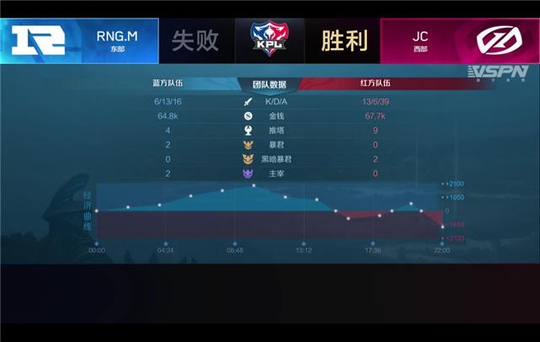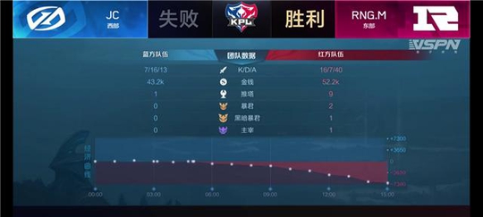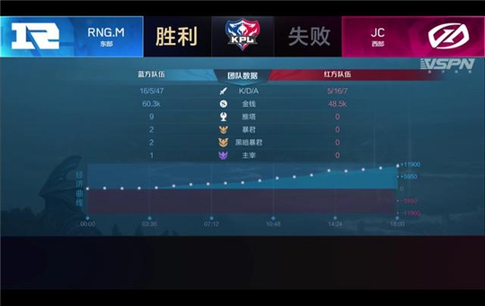 双方开局平稳发育。2分钟45秒JC公孙离杀掉孙策拿下一血。3分45秒中路爆发团战,RNG.M凭借阵容优势打出零换三推掉敌方中路二塔。6分钟上路爆发团战JC武则天收下太乙真人人头。9分钟RNG.M孙尚香连杀敌方两人推掉高地。同时JC曹操单带推掉敌方高地塔。11分钟RNG.M拿下主宰,打出团灭顺势一波!