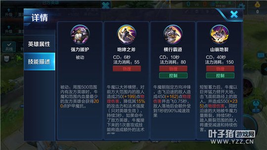 解析:牛魔的一技能命中敌人后会强化自身的下次普攻或者技能,触发额外的法术伤害。牛魔一技能不仅有不错的伤害,可以用来清兵或者对敌方英雄进行输出,关键在于它附带的虚弱效果,在团战中尽量让一技能的斧刃刮中敌方核心输出英雄,降低其输出能力。