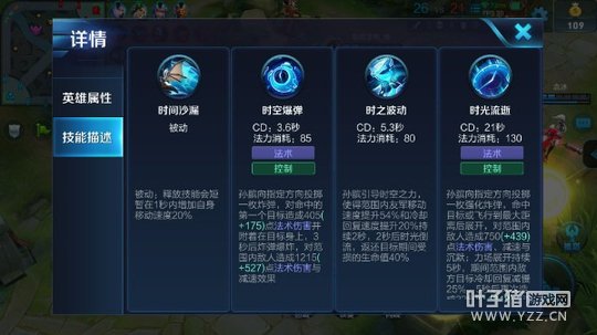时光流逝(三技能):同样的大范围伤害,但是有着打断敌方持续技能的效果。第二段高伤害和三技能范围内敌方英雄技能冷却时间变多的特效可以让敌人被迫走位躲避,起到分割战场的作用。