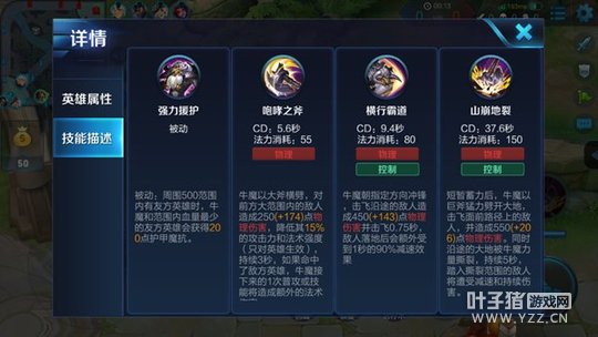 一技能是牛魔降低敌人输出的有效手段,对战时只要将技能打到敌方英雄身上,就可以降低对方的伤害,可以有效的降低队友的承受伤害,所以在和敌人近距离接触时,尽量先用一技能,这样可以降低敌人输出,同时还可以在随后的输出中对敌人造成额外法术伤害。