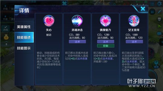 被动-失心:妲己的技能在造成伤害时,会减少目标的法术抗性(有上限),该效果会随英雄的等级而提升。