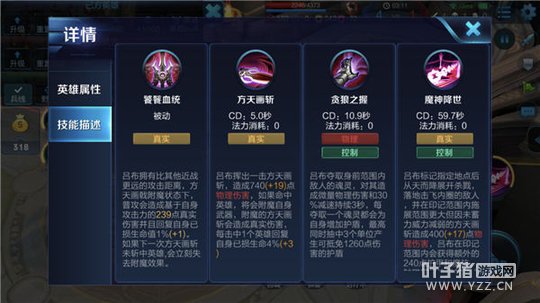 被动-饕餮血统:吕布拥有比其他近战英雄更远的攻击距离,方天画戟在附魔状态下,会使吕布的普攻附加额外的真实伤害,并回复自身的生命值。如果下一次一技能未斩中英雄,会立刻失去附魔效果。