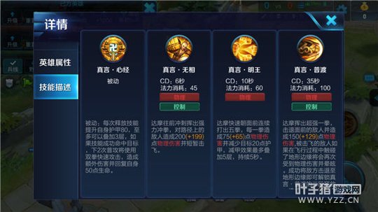 被动技能——真言·心经:被动技能提高了达摩战场生存能力,让达摩能够承受更多的伤害,在战场中可以凭借施放技能后的普攻,提高自身输出,并回复生命值,增强续航。