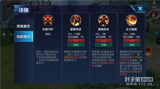 一技能——豪情突进:一技能使廉颇成为一名突进型英雄,位移和击飞效果提高了廉颇的先手能力,特别是位移可以穿墙使用,保证了廉颇的存活。