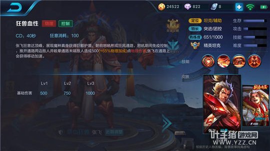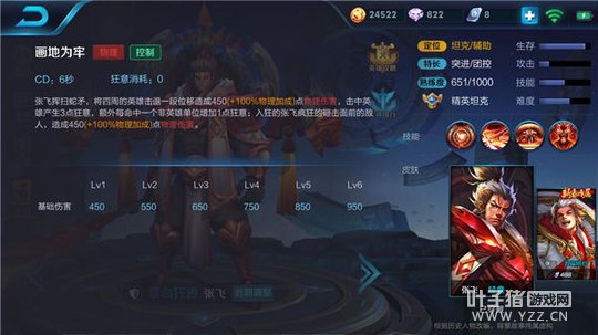 当张飞的狂意值积满之后,便可以释放自己的大招,为自己获取一个巨额的护盾,能够抗下敌方成吨的输出,同时张飞在释放大招之后自身的攻击力也会大幅度增强,释放大招的过程中还可以对指定位置造成一条狂风通道,使其通道末端的敌人处于晕眩状态,张飞位于通道中时,可以大幅度增加自身的移动速度,利用大招生成的狂风通道可以有效的击退敌人,打乱其阵容,并根据通道增加的移动速度快速来到敌方脆皮英雄的身边,利用自己变身后超高的伤害来牵制敌人。