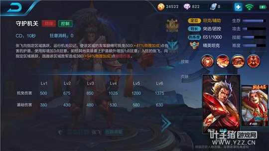 张飞向指定方向跳跃并为范围内的队友和自己增加一个护盾,这个护盾能够抵消一定量的伤害,是一个非常给力的技能,关键时刻更是能够通过二技能为残血队友增加一个护盾,并利用一技能击退想要追击残血队友的敌方英雄,变身之后二技能可以向指定方向跳跃,借助被动技能可以将范围内的敌人减速,从而有效的牵制敌人,并且张飞变身后的二技能具有非常高的伤害。