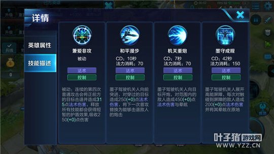墨子是一名强势的法坦,拥有不俗的POKE能力,并且凭借大招带来的控制效果,能在团战中为队友创造良好的输出空间,二技能还拥有控制效果,在远程消耗敌人的同时,还能骚扰其走位,破坏敌方战斗节奏。