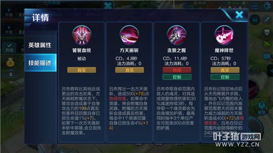 被动-饕餮血统:吕布的攻击距离比其他近战英雄更远,方天画戟在附魔状态下,吕布的普攻将附带真实伤害,并能回复自身生命值,若下次方天画斩未斩中英雄,会立刻失去附魔效果。
