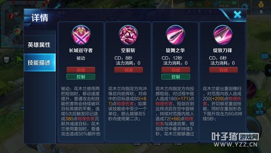技能综合解读:花木兰的技能机制多,自身适应能力强。操作较为复杂,但是极为强力,不论面对何种对手都能够轻松应对。实战中双剑形态近身对手,打出控制,切换重剑打出爆发即可让敌方遭受重创。、