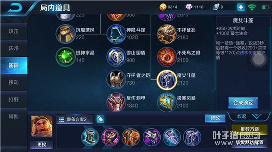 出装推荐:抵抗之靴+暴烈之甲+红莲斗篷+霸者重装+冰痕之握+魔女斗篷