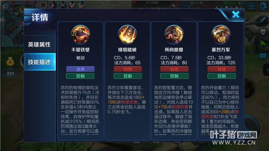 技能解析:1、苏烈的烽烟踏破范围较大,用于清理兵线和消耗敌人的血限非常的有效;
