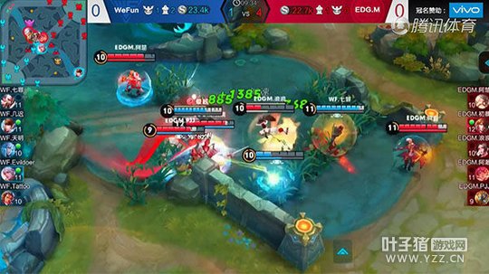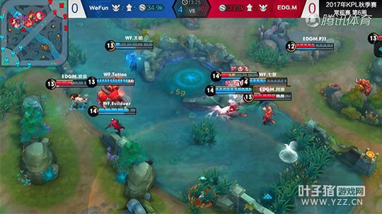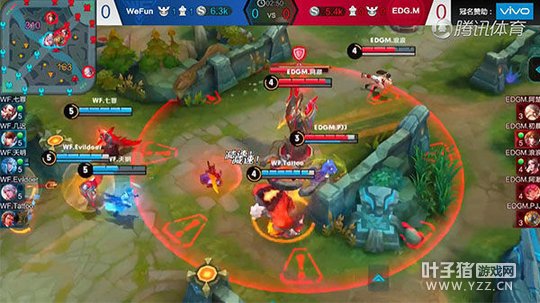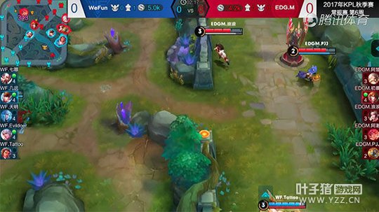 比赛进行到2分47秒,WF.七罪的曹操再次游走到中路,WeFun瞬间集结起五人试图推掉敌方中路一塔,消耗了防御塔一定的血量,并逼迫对手全部赶到中路守塔。