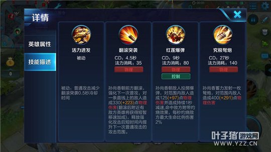 一技能-翻滚突袭:孙尚香朝指定方向翻滚一段距离,并强化下一次普攻,对直线上敌人造成物理伤害,并在释放后短时间内提升下一次普攻的攻击范围。如果翻滚后附近有敌方英雄,孙尚香将获得短暂移速加成。