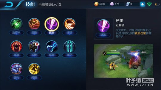 分析:杨戬可根据阵容选择自己的作战定位,若选择在野区发育,惩击能对身边的野怪造成真实伤害和晕眩,加快杨戬的打野进速度,是打野必备的技能。