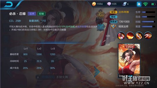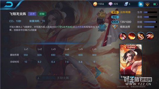 不知火舞的技能大多是指向型技能,爆发能力和持续输出能力都很优秀,而且不需要考虑蓝量的问题,对于续航能力是一个很大的保证,可以通过命中目标不断的回复能量值,让不知火舞随时保持战斗力。虽然一技能、大招施法距离近,但爆发高、控制足,二技能施法距离长,冷却CD时间短。法师、刺客双定位类型的技能也让不知火舞更加热门。