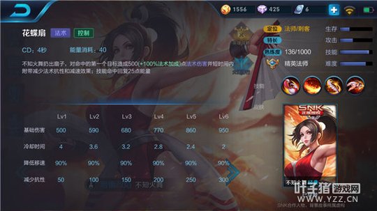 解析:不知火舞的主要远程消耗手段,具备伤害高、减速强、冷却快的特点,而且减少法术抗性的特点能让不知火舞之后的连招对敌人造成更高的伤害,提高对残血的击杀率。