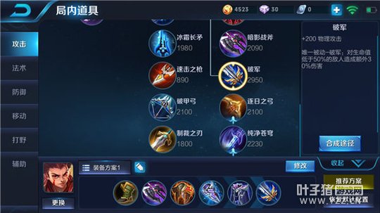 六神装推荐:影忍之足+暗影战斧+红莲斗篷+冰痕之握+魔女斗篷+破军