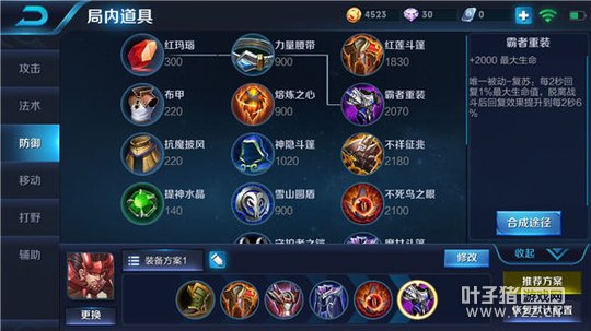 六神装推荐:影忍之足、红莲斗篷、反伤刺甲、魔女斗篷、不死鸟之眼、霸者重装