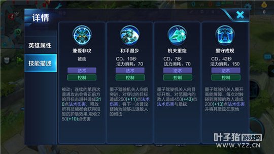解析:一个输出技能,可以对远距离敌人造成伤害,而且具有晕眩控制效果。实战中一般都会作为墨子的先手技能。