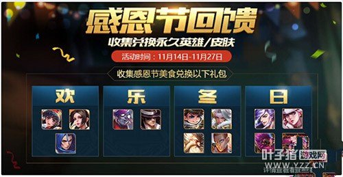 11月23日感恩节美食开放兑换时,玩家可消耗50个感恩节美食,兑换感恩节礼包:欢。打开后可获得以下奖励之一:橘右京、不知火舞、娜可露露。不会获得已有英雄,若以上奖励全有,则会转化成对应数量的英雄碎片!